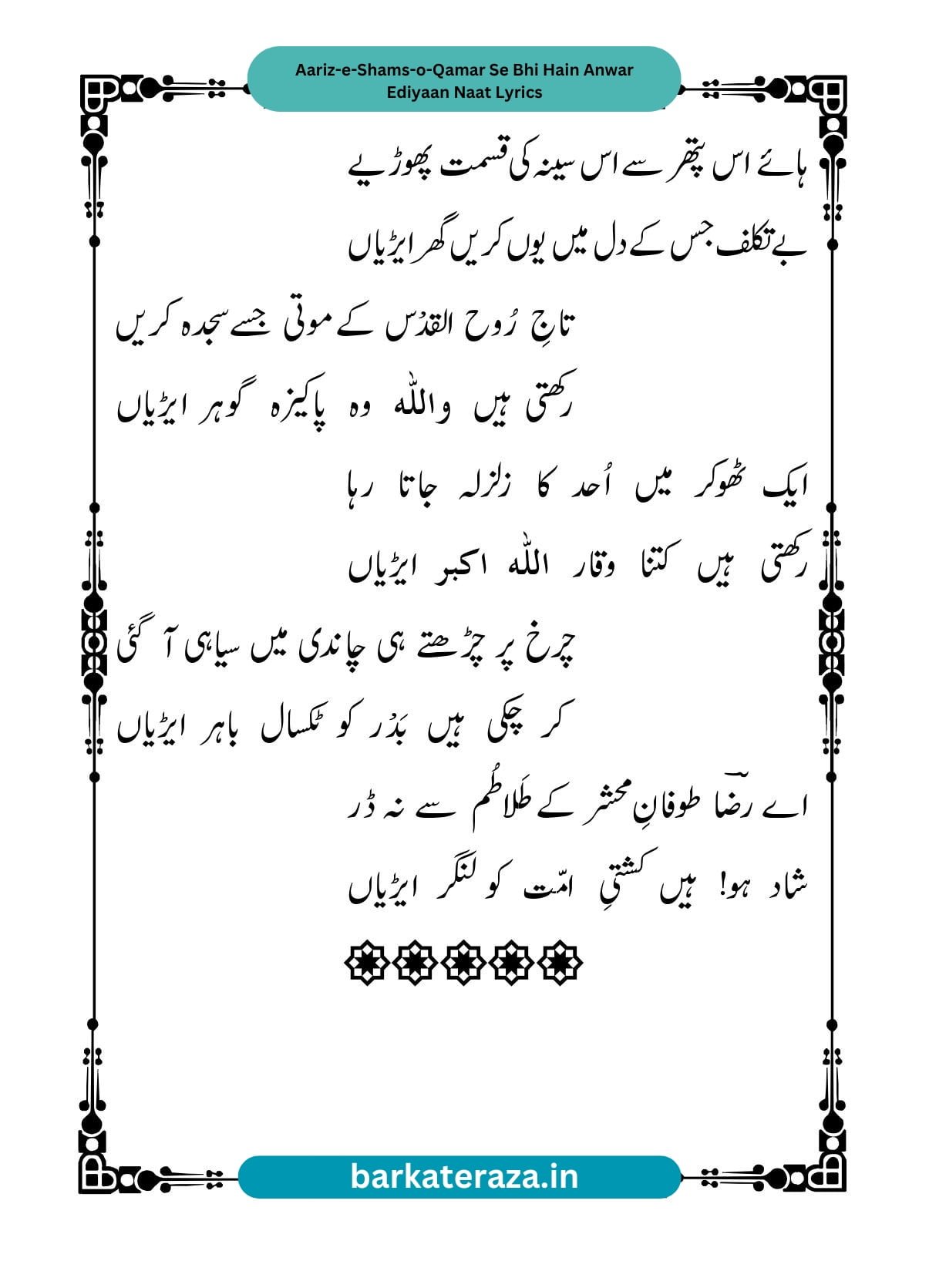 AARIZ-E-SHAMS-O-QAMAR SEY BHI HAIN ANWAR AERIYAN NAAT LYRICS