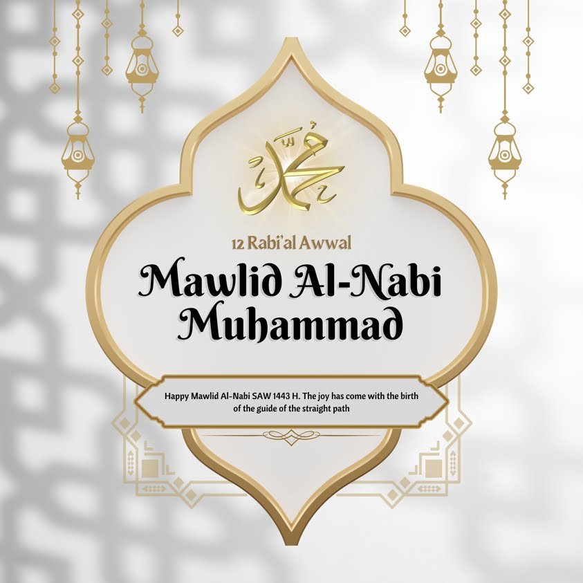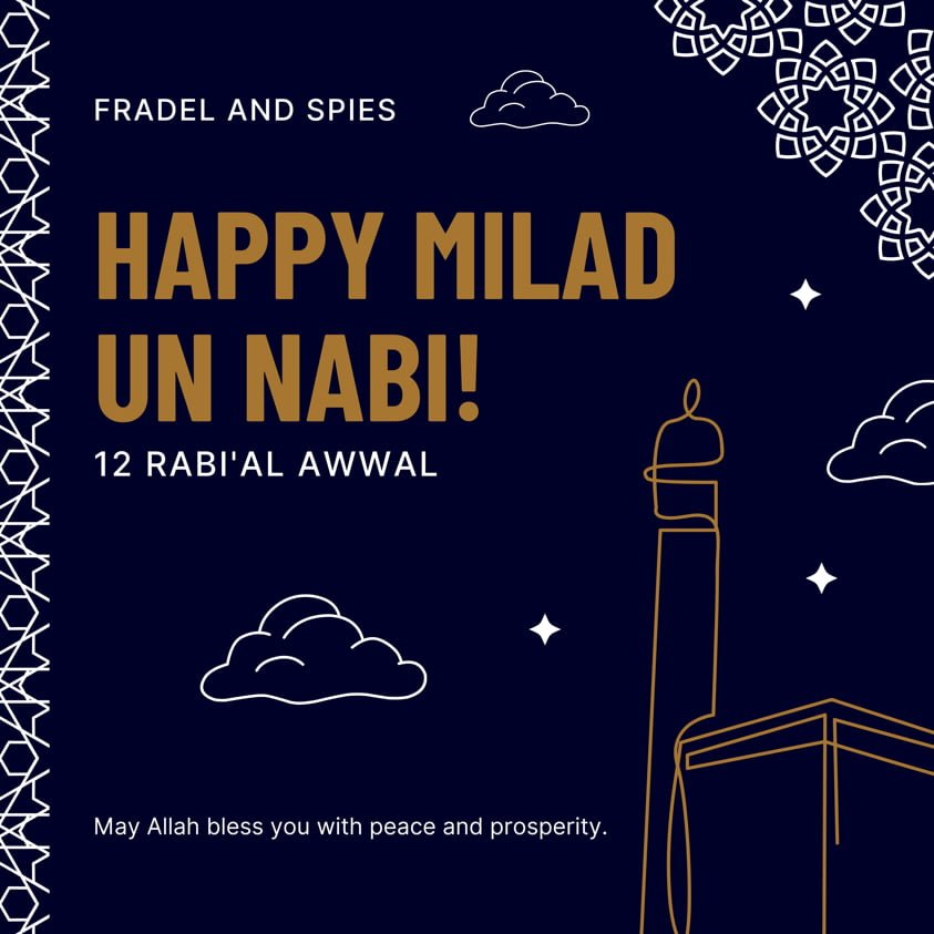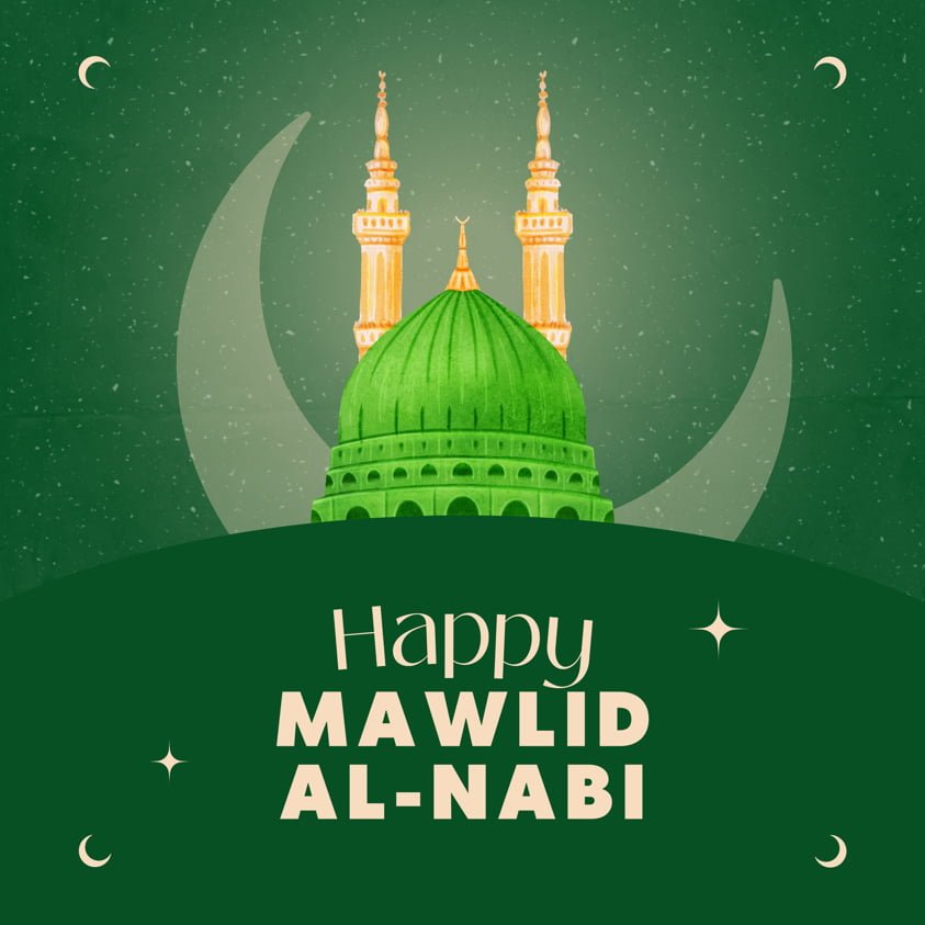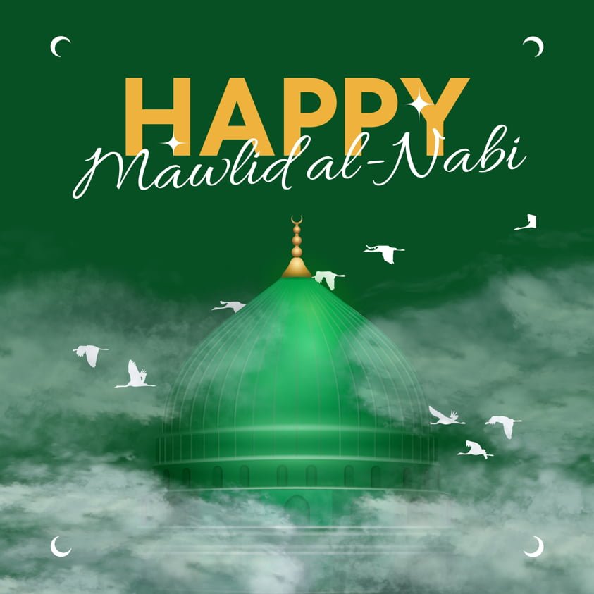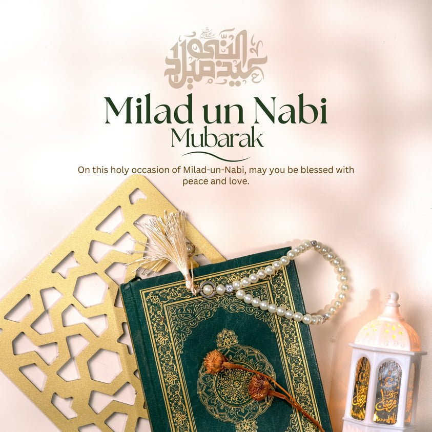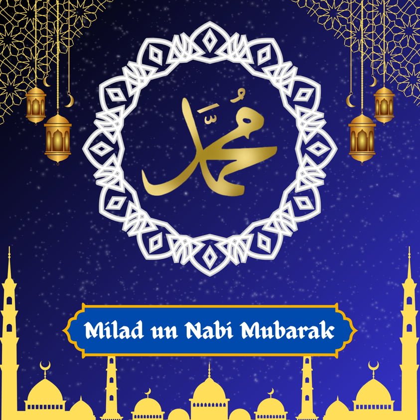 The main message reads: “Milad un Nabi Mubarak” in bold white font, which is a greeting for the celebration of the Prophet Muhammad’s (PBUH) birthday.