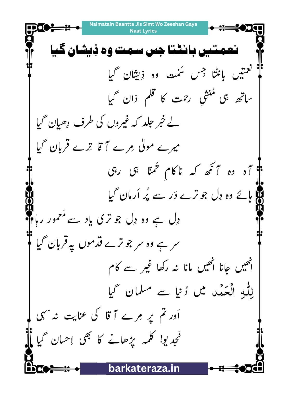 Naimatain Baantta Jis Simt Wo Zeeshan Gaya Naat Lyrics