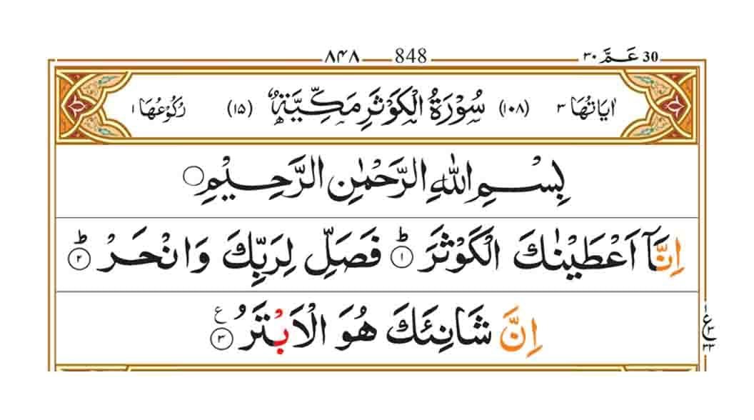 | Surah Al Kausar Ayats | Surah Al Kausar Words | Surah Al Kausar letters | Surah Al Kausar Rukus |