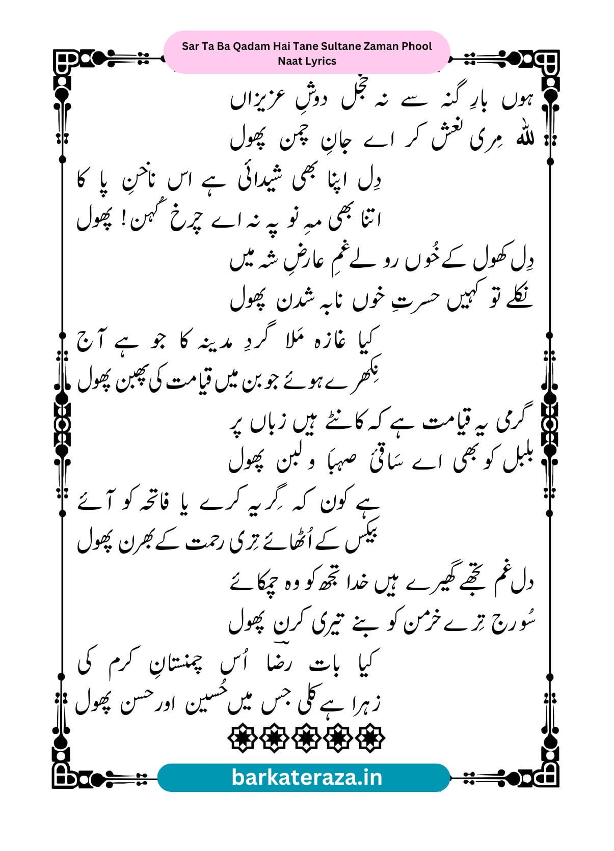 Sar ta ba-qadam hai tan e sultane zaman phool Naat Lyrics